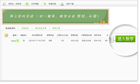 2、学生:收到预约后, 【空中课堂】 现在的预约 页面,在教学开始时间点前后120分钟内,该预约记录后面会自动出现 "进入教学" 按钮,点击后便可进入教学软件。